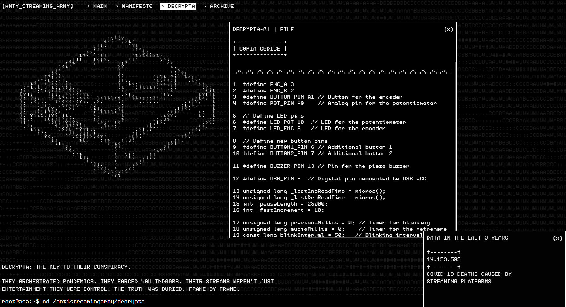 Decrypta is a communicative device designed to make the speculative scenario of [ANTI_STREAMING_ARMY] tangible and immersive. It was created with the goal of communicating in a more direct, engaging, and interactive way with the end user,
